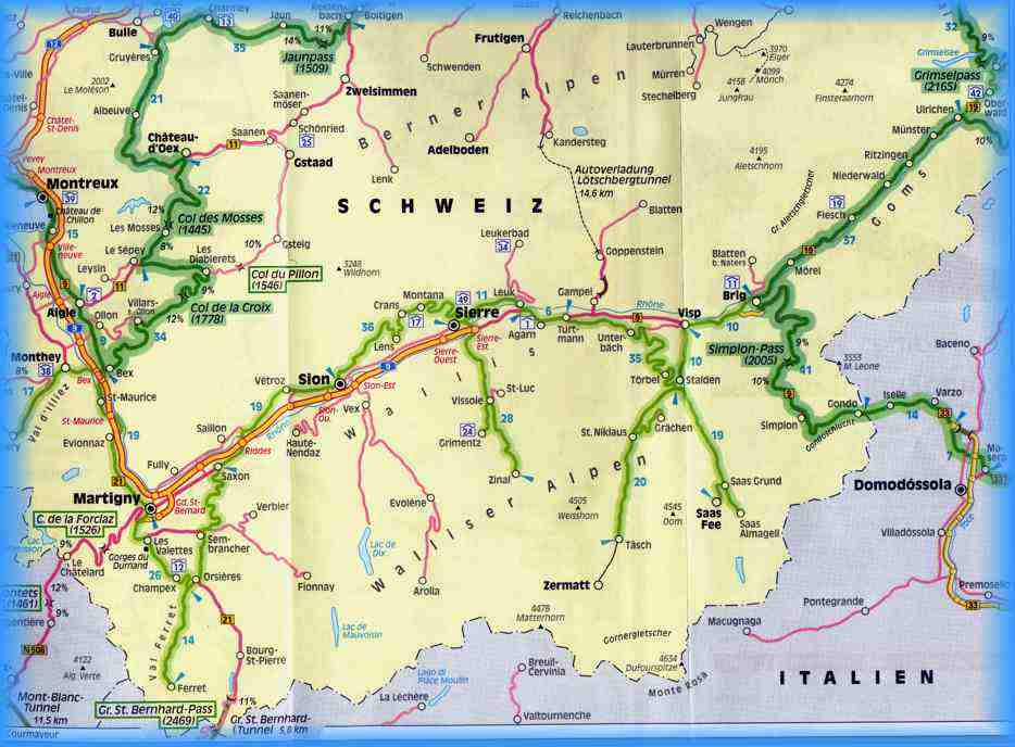 Samstag: Wir wollen heute zum Mont-Blanc und fahren los über Martigny den schön zu fahrenden C. de la Forclaz nach Charmonix . Von da aus haben wir, und ca. 5000 Touristen aus aller Welt, einen wunderbaren Ausblick auf den Mont-Blanc . Weiter geht es durch den Mont-Blanc Tunnel (11,5 km) in Richtung Aosta , um über den Gr.St.Bernhard zurück in Schweiz zu kommen. |