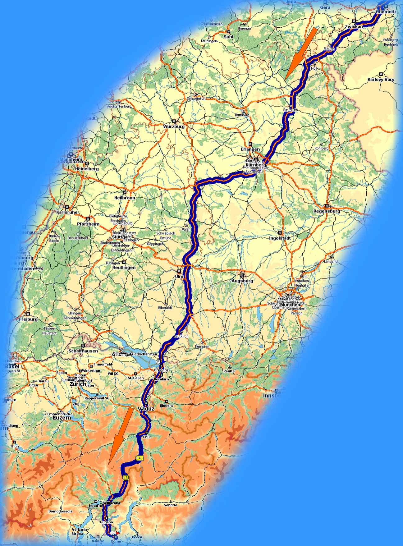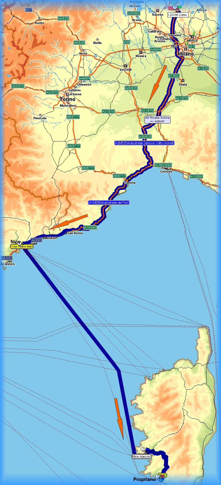 Freitag: 8.Juni 2007 6:00 Uhr: Startpunkt unserer Korsika Tour mit Heidrun und Heinz, ist die Raststätte Auerswalder Blick an der A4. Wir fahren die A72 weiter bis Hof, über Nürnberg bis zum Bodensee (12:00 Uhr sehr warm). Bei Bregenz lassen wir die Schweiz zum Transitland verkommen ;-( über Chur, Splügen und Belinzolla geht es nun bei Lugano nach Italien. Gegen 17:00 Uhr in Cernobbio am Lago di Como angekommen, suchen wir unser erstes Quartier. Wir übernachten im Albergo-Centrale . 848 km |