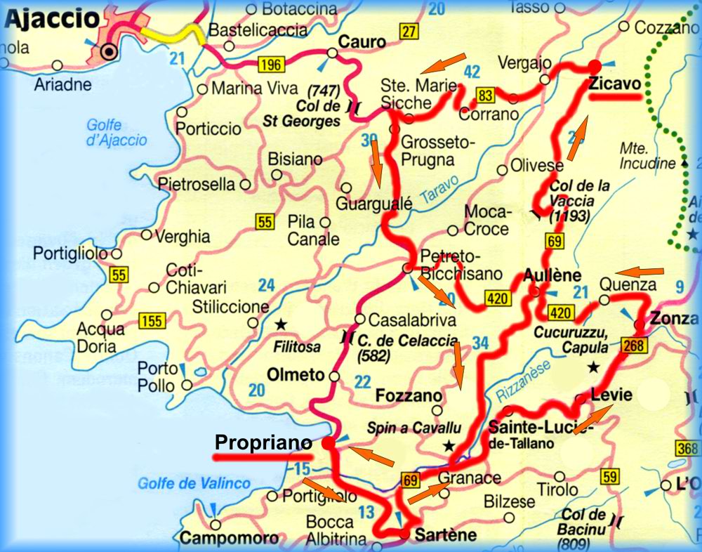 Col de St. Eustache und weiter nach Aullene. Das wir nun ein zweites mal passieren werden. Aullene ist ein sehr schönes "malerisches Gebirgsdorf". !! Hier biegen wir auf die D69 und fahren nach Zerubia bis kurz vor Spin a Cavallu und zweigen hier rechts auf die D119 nach Arbellara ab. Auf dieser urigen einsamen Straße fahren wir bis nach Propriano . |