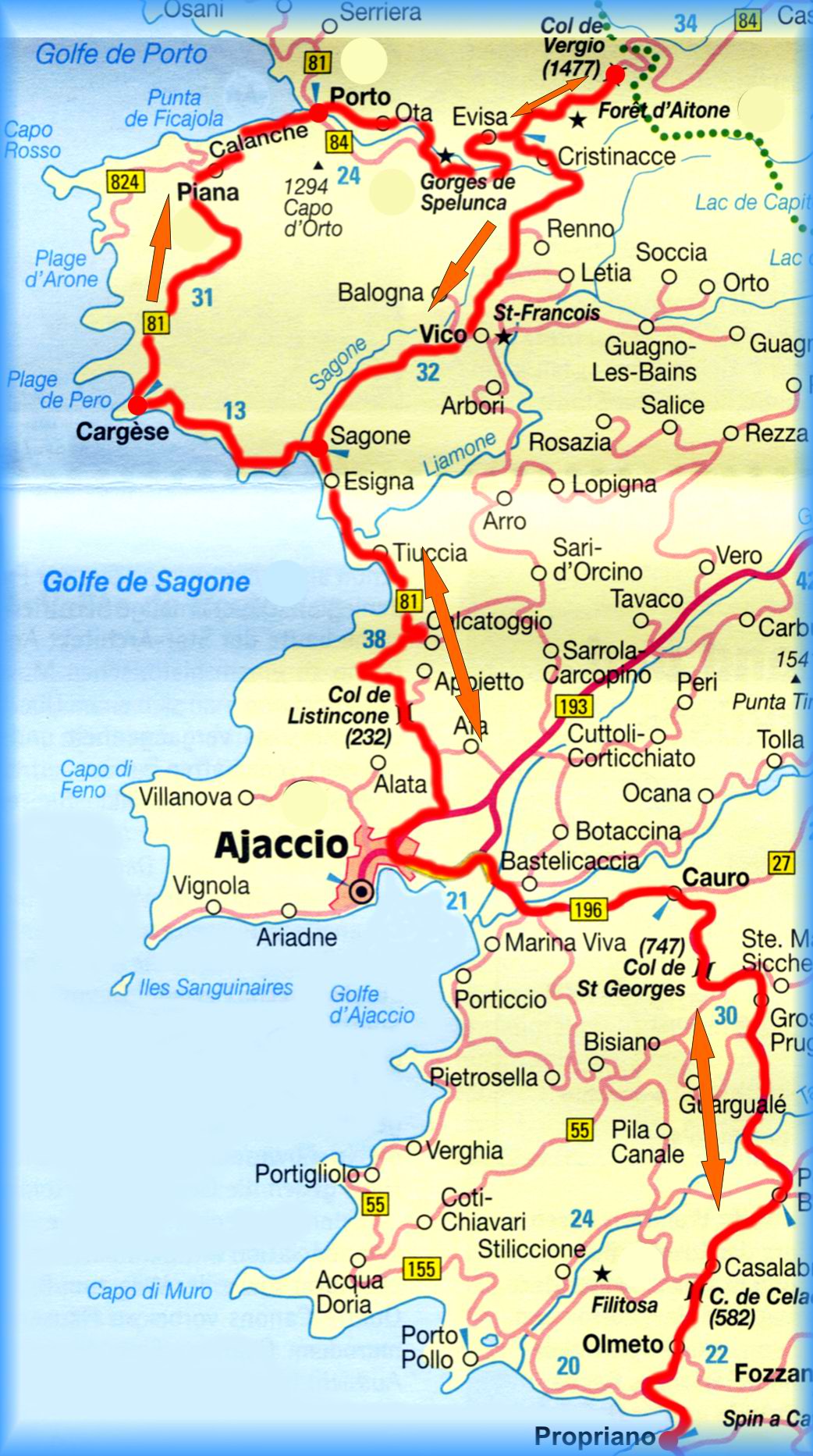Nun geht es wieder zurück auf der D84, bis zum Abzweig auf die D70 um nach Sagone abzubiegen. In Sagone angekommen gönnen wir uns eine Abkühlung im Golfe de Sargone . Ab jetzt es geht wieder zurück auf der D81 bis Ajaccio und weiter auf der N196 bis Propriano . |