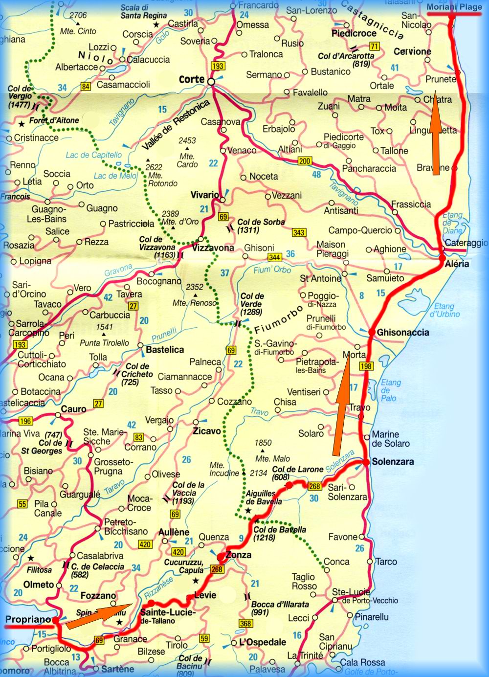 Nach den Bavella Pass geht es über den Col de Larone (608 m) weiter in Richtung Solenzara hier wird es wieder wärmer. Ab Solenzara wird es richtig warm, wir fahren nun auf die N198 Richtung Bastia . Entlang der viel befahrenden "Küstenstrasse" geht es über Ghisonaccia und Alèria nach Moriani Plage . Dies wird unser östliches "Basislager" auf Korsika. Ursprünglich war Moriani Plage der Hafen von San Nicolao .