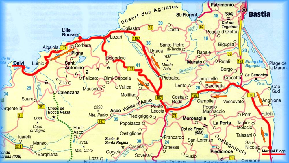 Montag: Eine Ausfahrt nach Calvi steht heute an. Heute ist es leicht bewölkt und die Temperatur beträgt nur 25 C°. Wir fahren die N198 in Richtung Bastia und biegen auf die N193 nach Ponte-Leccia ab. Nun bleiben wir auf der N197 (nicht die N1197 !) und erkunden nun das Navaccia-Tal um kurz vor L'Ile-Rousse an das Mittelmeer zu stoßen.