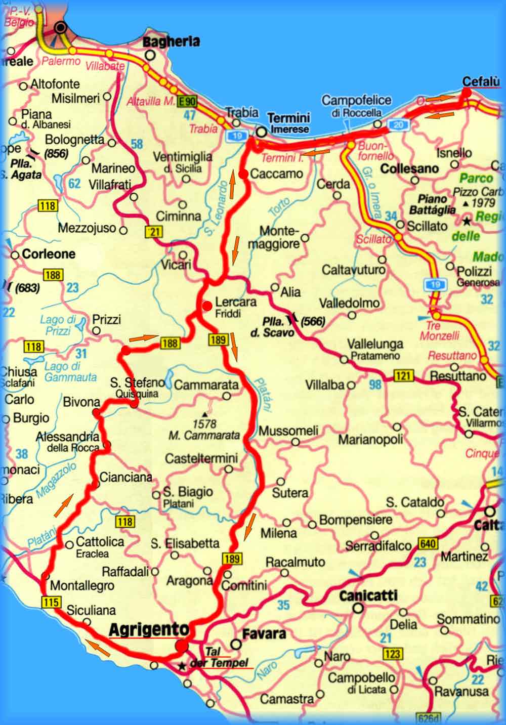 und biegen dort nach Süden ab, bei Caccamo werden die Straßen wellig und sehr sandig und es fängt hier leicht an zu nieseln. Jedoch in Lecara Fridi wird das Wetter wieder besser und wir fahren nun auf die (189) bis Agrigento .