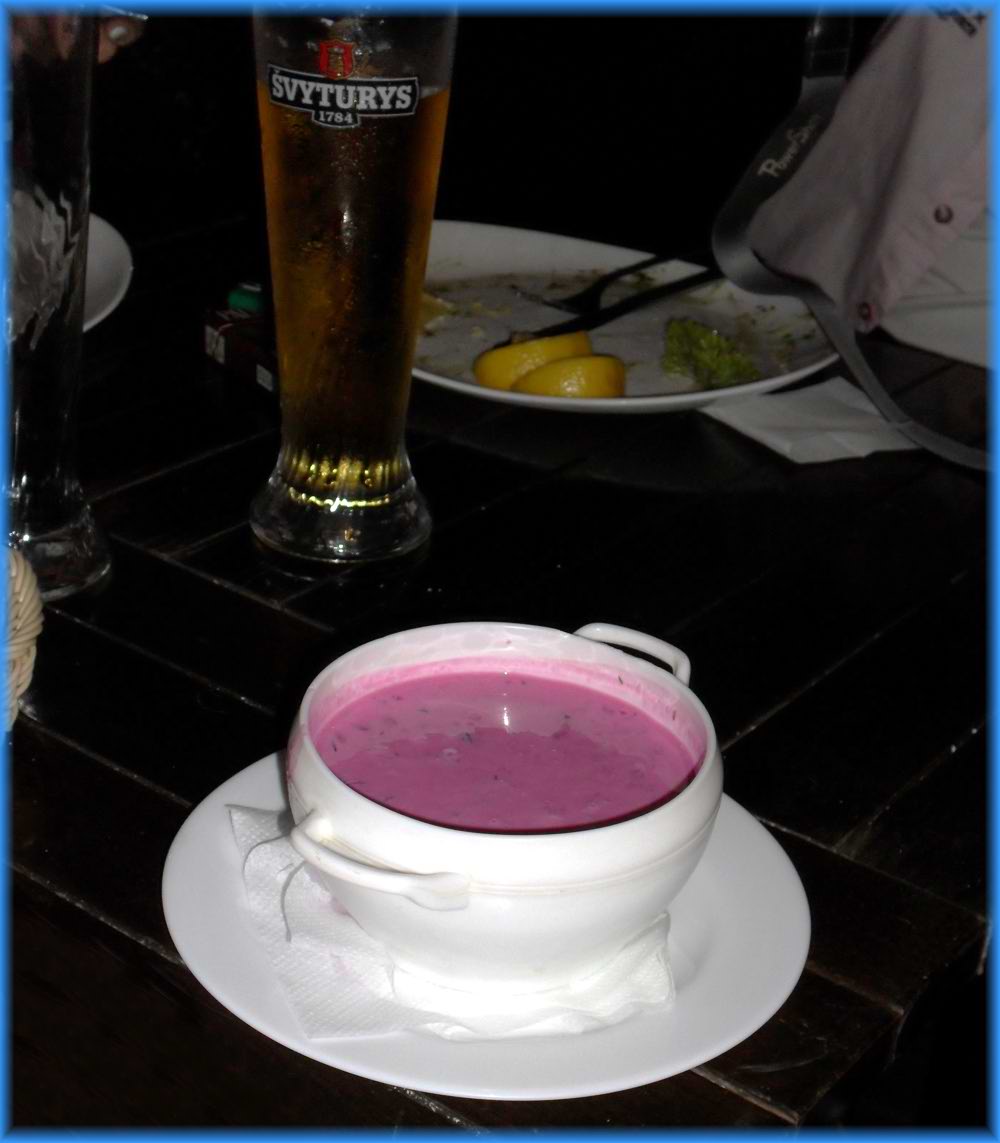Am alten Hafen essen wir zu Abend. Eine einheimische Spezialität ist Litauischer kalter Borschtsch, eine kalte rote Betesuppe die man probieren sollte. šaltibarščiai |