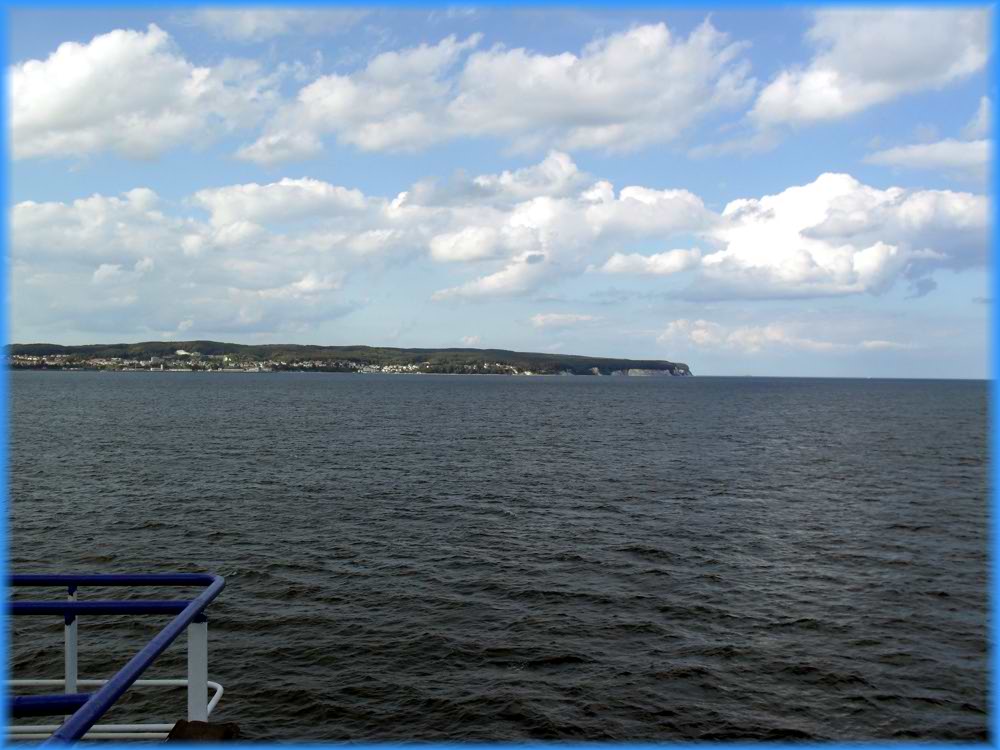 Land in Sicht ! gegen 14:40 Uhr sehen wir Rügen . Es dauert nun noch bis 18:00 Uhr bevor wir von der Fähre dürfen und in Sassnitz an Land gehen.