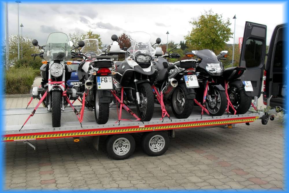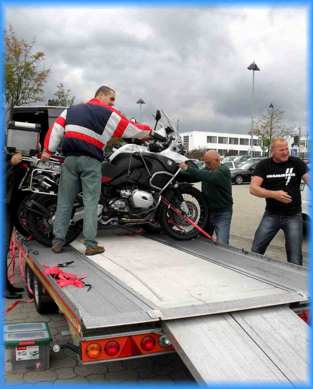 Do. 04.10.2012 Heute heißt es die Bikes aufladen. Wir treffen uns 15:00 Uhr auf einen Parkplatz in Chemnitz Nord. Das verladen der Motorräder verläuft reibungslos, man bemerkt das Steffen dies nicht zum ersten mal tut. |
