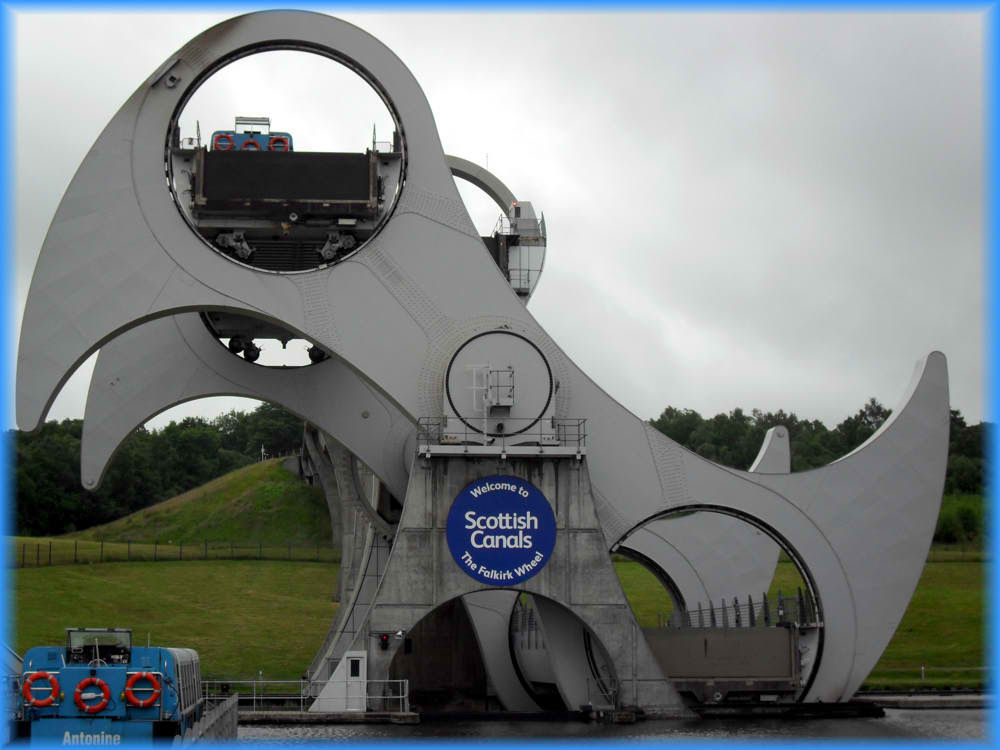 Fr. 28.06.2013 Der Tourstart ist heute 09:10 Uhr und wir fahren bei leichten Nieselregen in Richtung Westen los, es sind 12C°. Unser erstes Ziel ist ein Schiffshebewerk der ganz besonderen Art, Falkirk Wheel . |