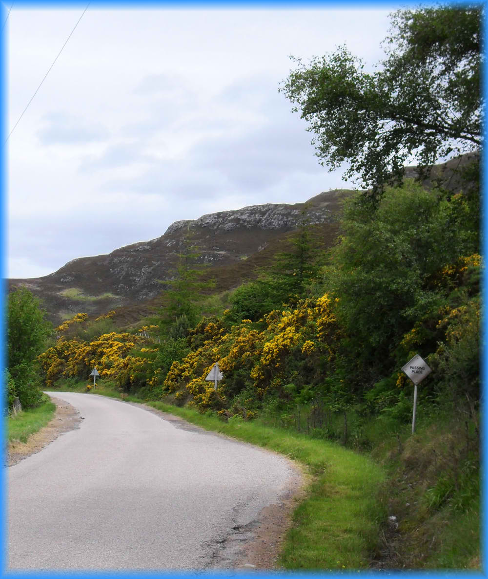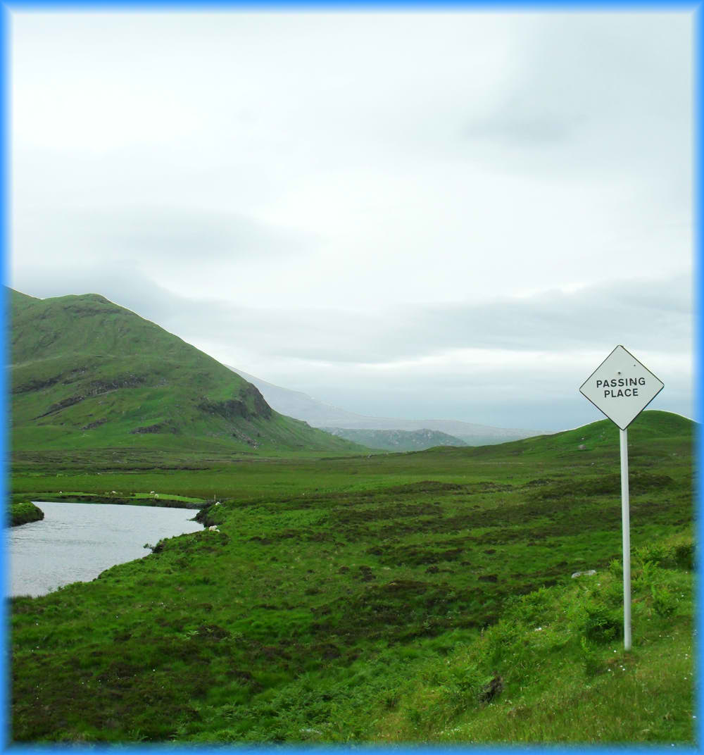 An ausgeschilderten Ausweichstellen den PASSING PLACE wird rücksichtvoll einander vorbei gelassen. Der schottische Kraftfahrer ist sehr rücksichtvoll und cool !!! Weiter fahren wir vorbei am Loch Assynt ... | |||