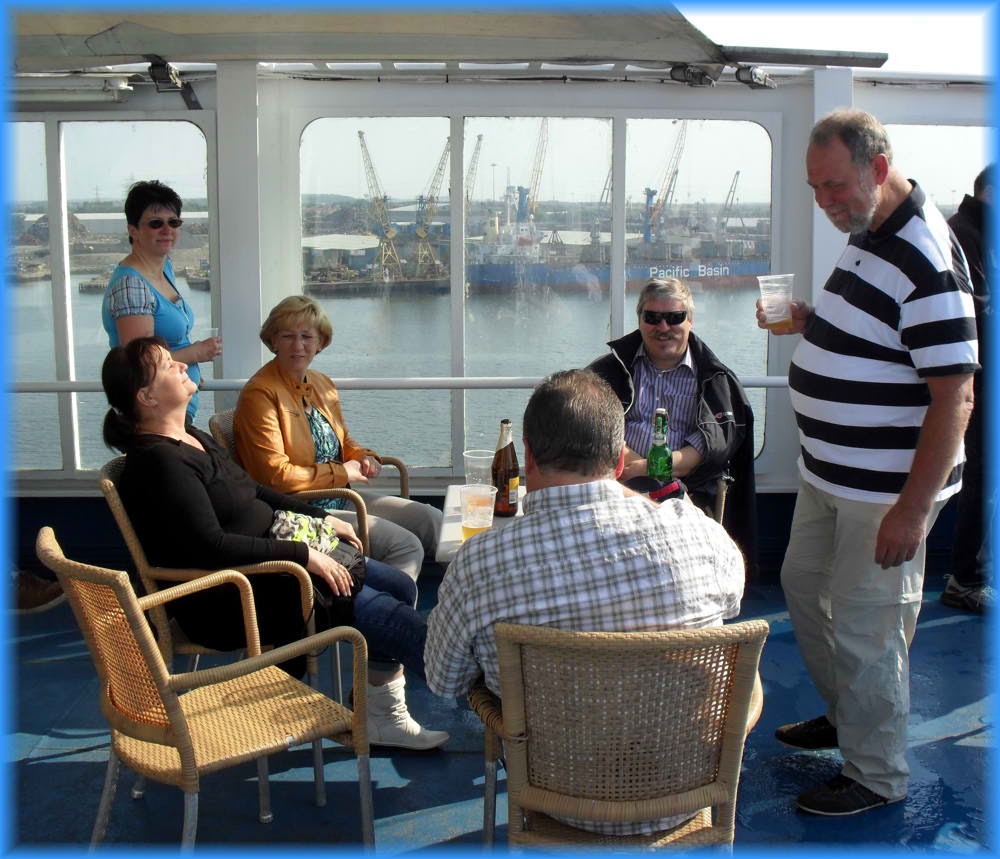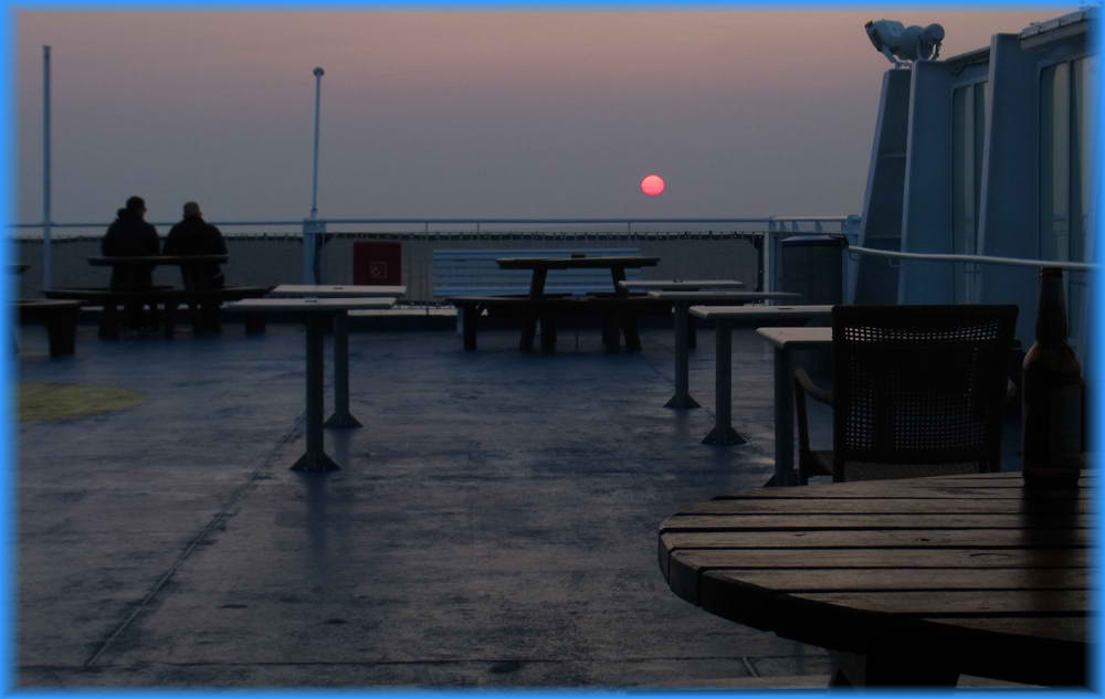 Wir beziehen nun unsere Kabinen auf der Fähre, drehen unsere Uhren wieder eine Stunde vor. [denn] An Bord der Fähre gilt wieder die Mitteleuropäische Sommerzeit(MESZ) = (deutsche Zeit). |