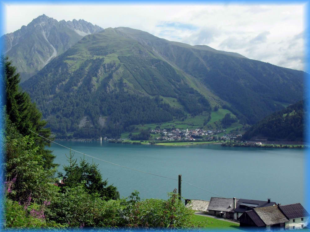 ... Alpengasthof Bergkristall . Weiter gehts und wir kommen wieder in Reschen (Resia) am nördlichen Ende des Reschensee's heraus, die Umrundung ist nun abgeschlossen. |