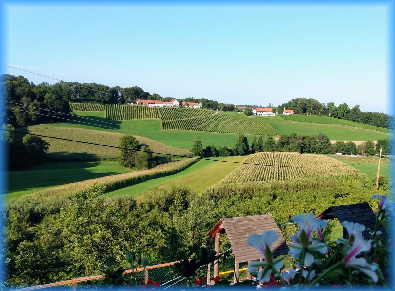 Unser erste Unterkunft ist das Gasthaus weinkulinarium-kapun bei der Familie Tscheppe-Kapun im Grubtal 39, Gamlitz. Hier machen wir Quartier für 6 Tage in einen sehr tollen Zimmer, mit diesen Ausblick. |