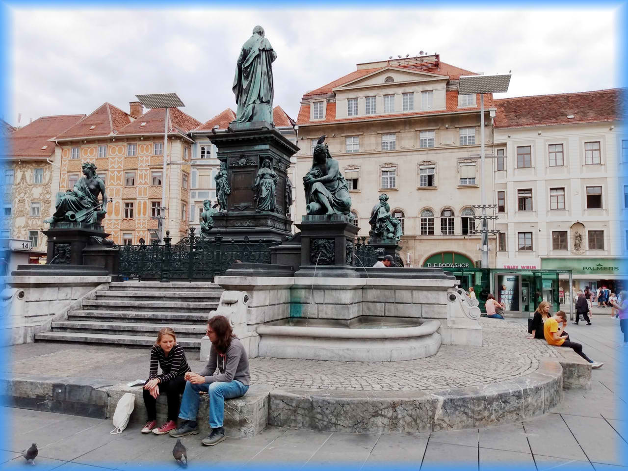 Erzherzog-Johann-Brunnen Der Brunnen mit einem überlebensgroßen Bronzefigur des Erzherzogs Johann und den Darstellungen der vier Flüsse Mur, Enns, Drau und Sann |