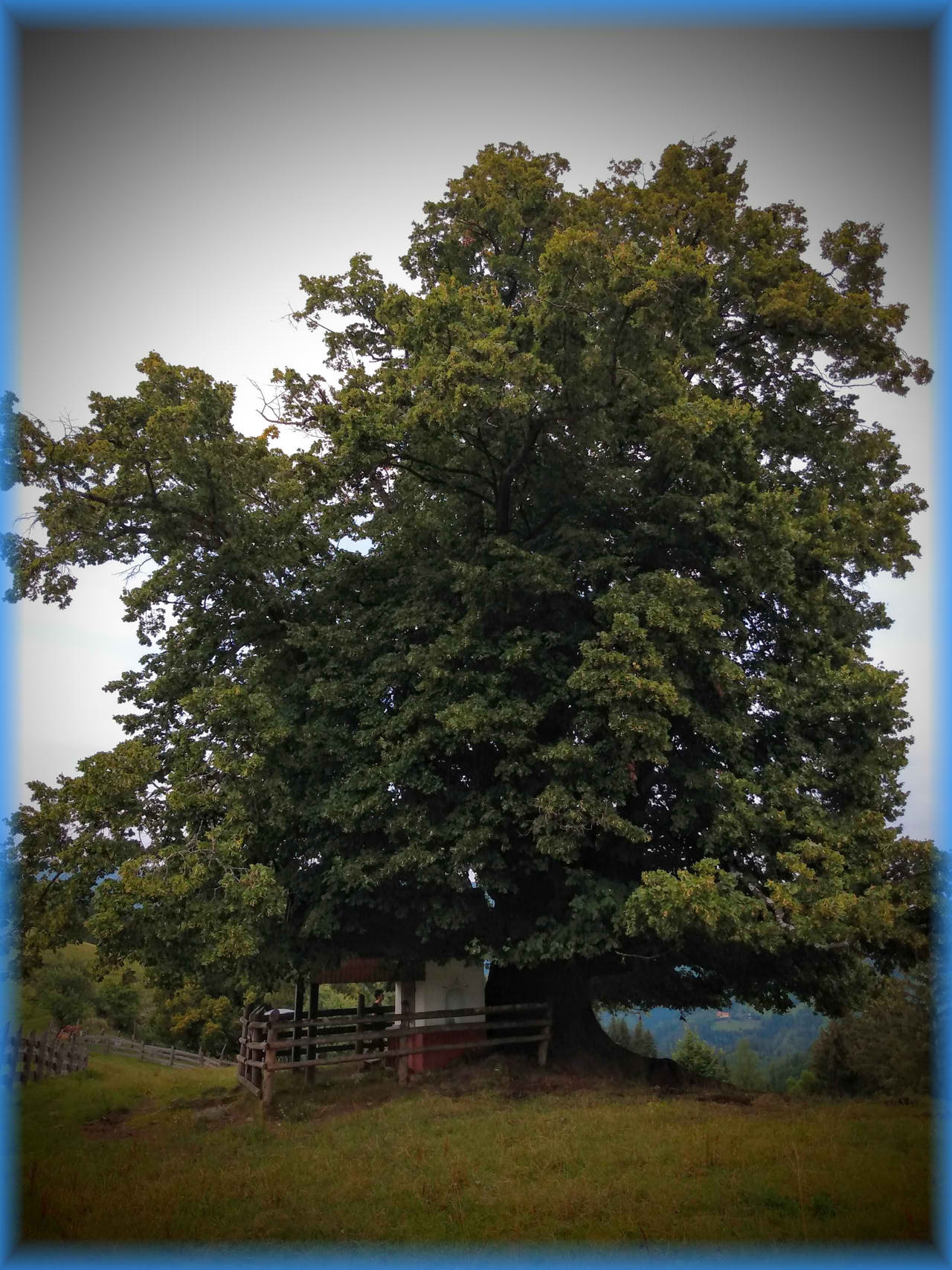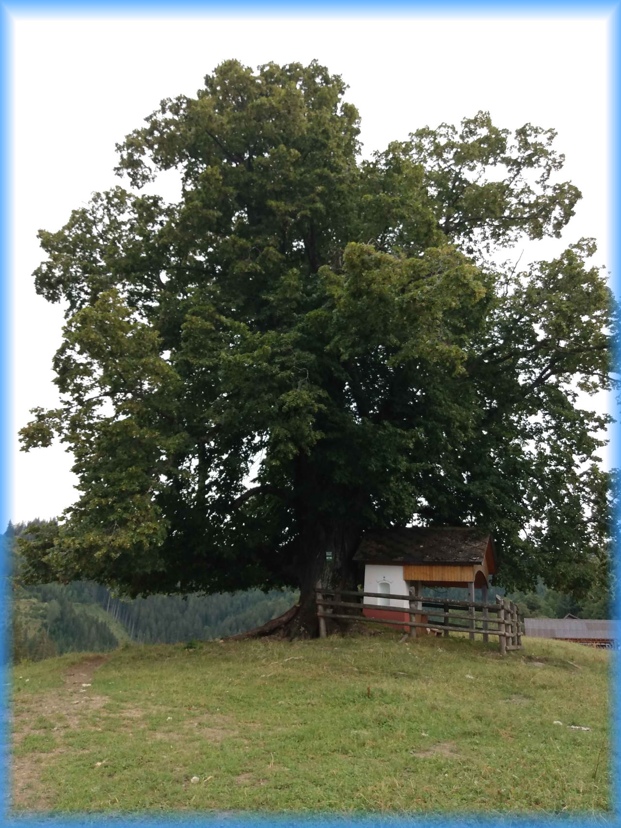 ... Tilia cordata die Winter-Linde mit einer kleinen Kapelle daran ... | |||