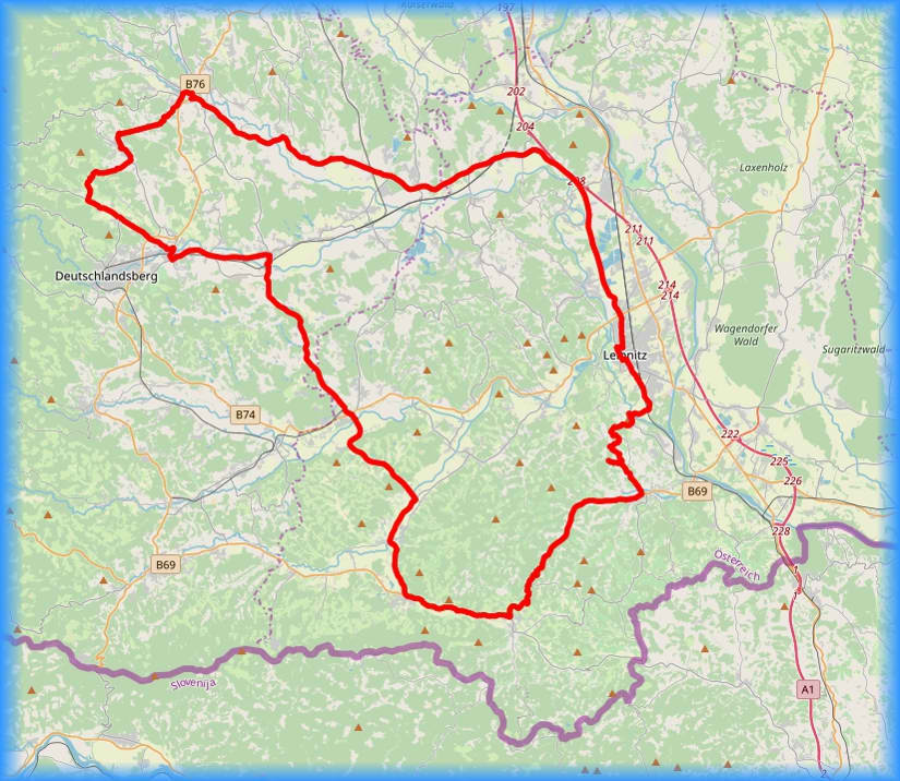 ... weiter südlich nach Haslach . Nun weiter nach "Leutschach an der Weinstraße" und danach nördlich bis Gamlitz . | |||