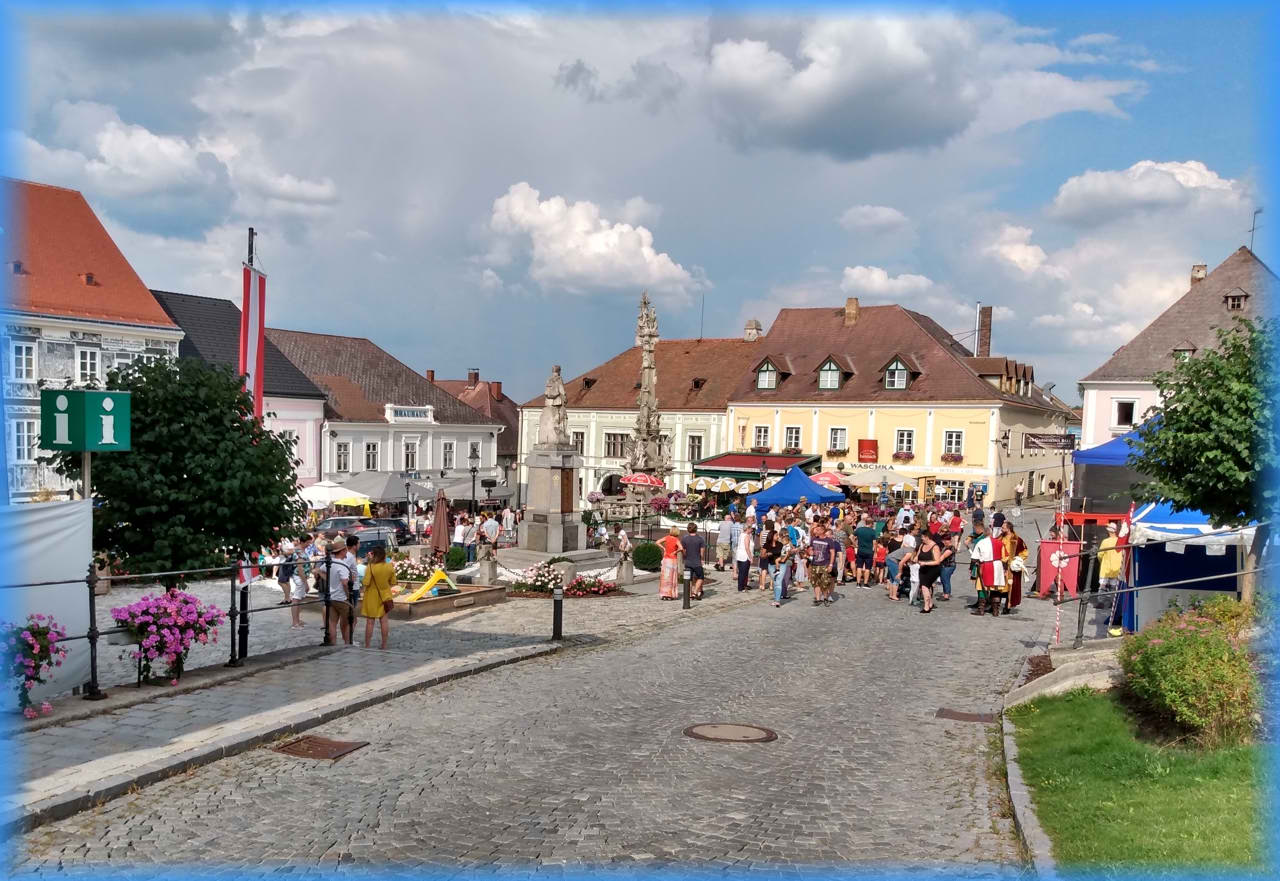Hier findet heute ein Mittelalter-Spectaculum am Stadtplatz statt.Dreifaltigkeitssäule |