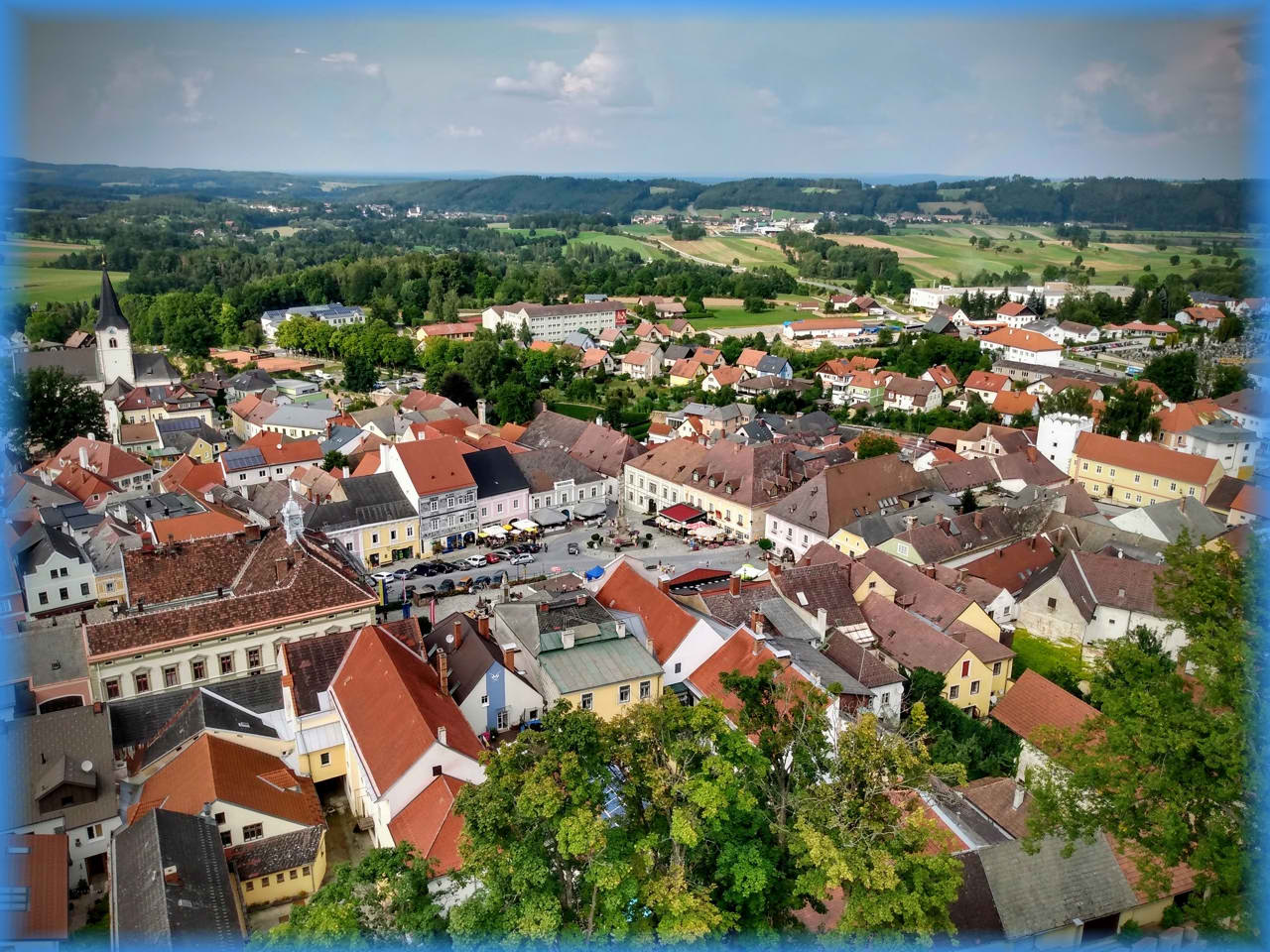 Wir haben Glück und werden trotz später Stunde noch hinein gelassen und besuchen das Museum Schloss & Stadt Weitra . Dafür einen großen Dank an die "Schloss Herrin" und können so diesen schönen Blick auf Weitra vom Schlossturm aus geniesen. | |||
