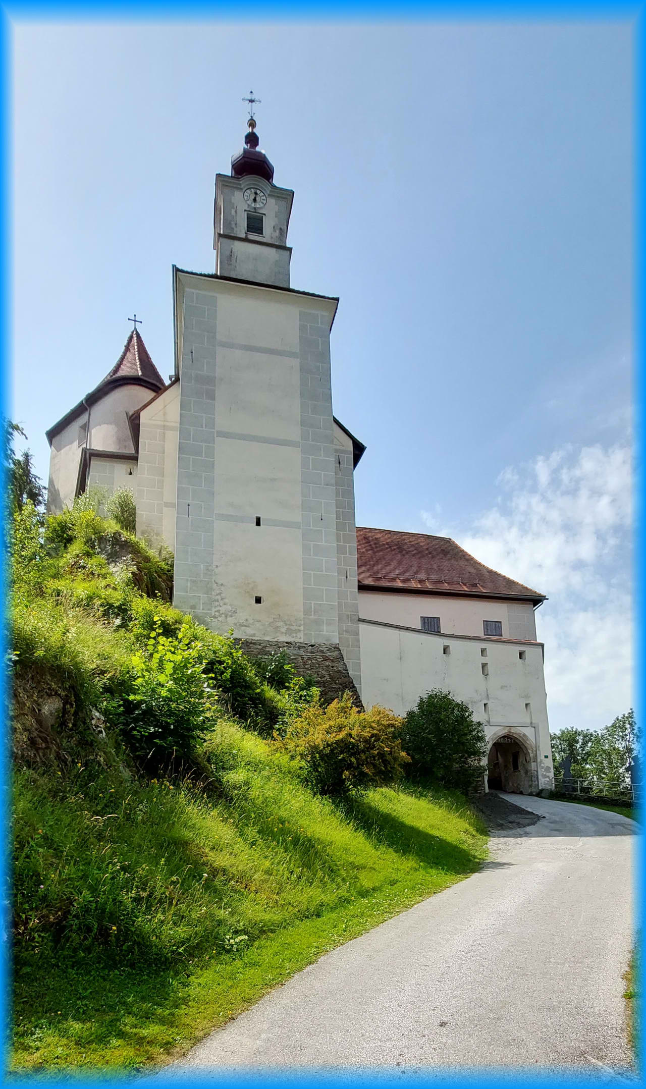... und kommen 13:30 Uhr 🕜am Schloss Pöllau an . Der Blickfang hier ist der linke Turm, das ist die Stiftskirche St.Veit . |