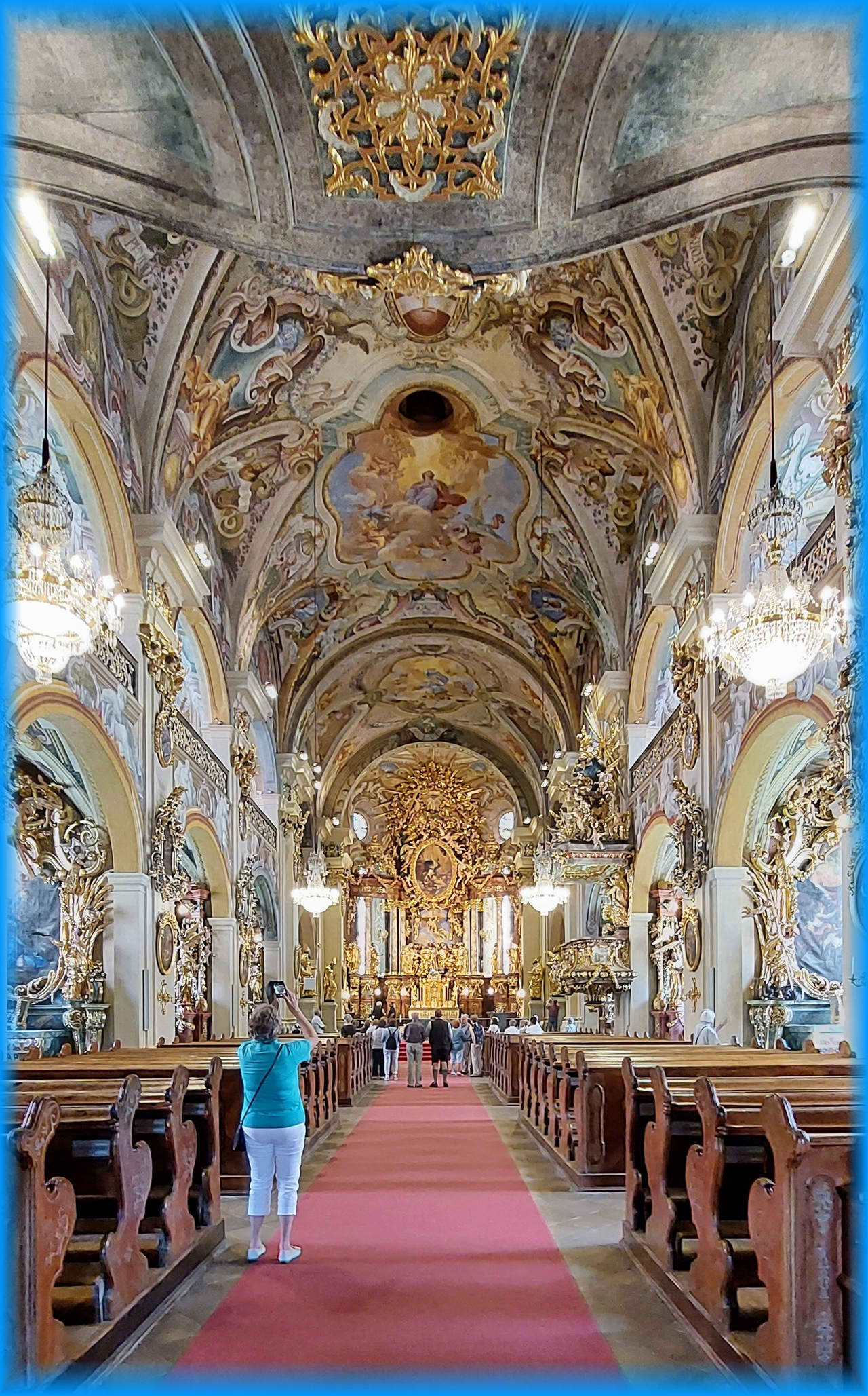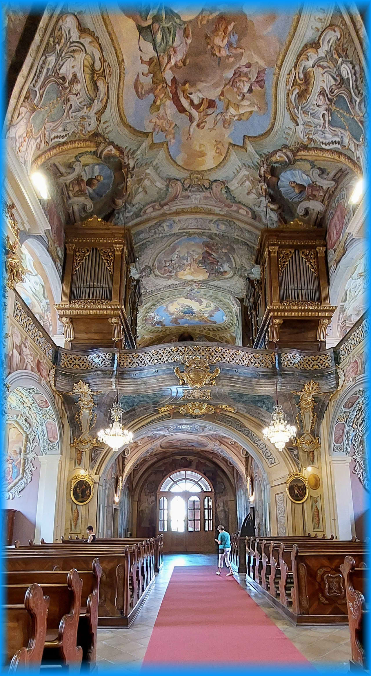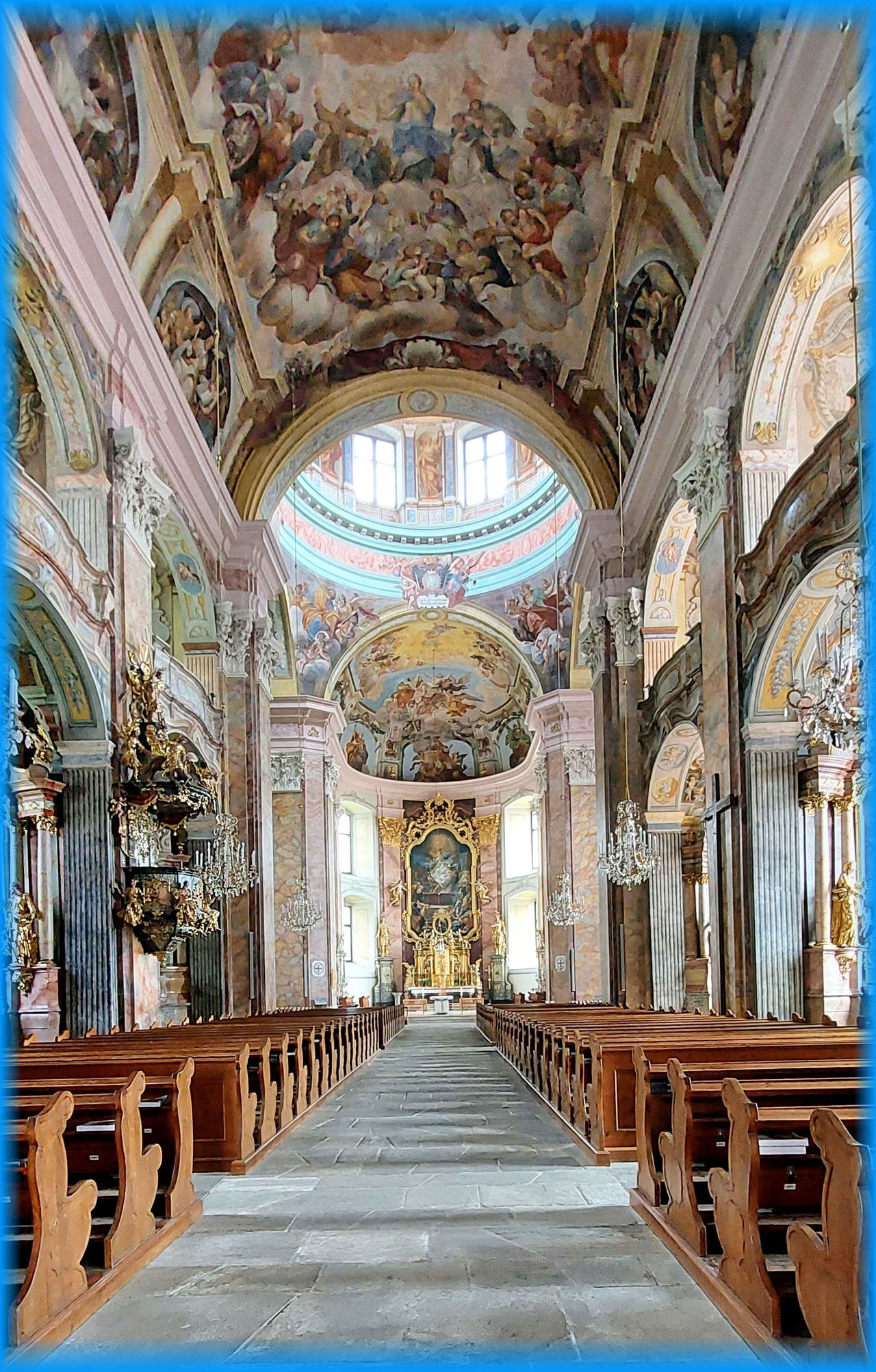 Im Langhausgewölbe sind sehr Sehenswerte Deckenfresken zu bewundern. Nach soviel Kultur ist Zeit für eine Rast im Schloßwirt Schmitz , welcher auch sehr zu empfehlen ist. |