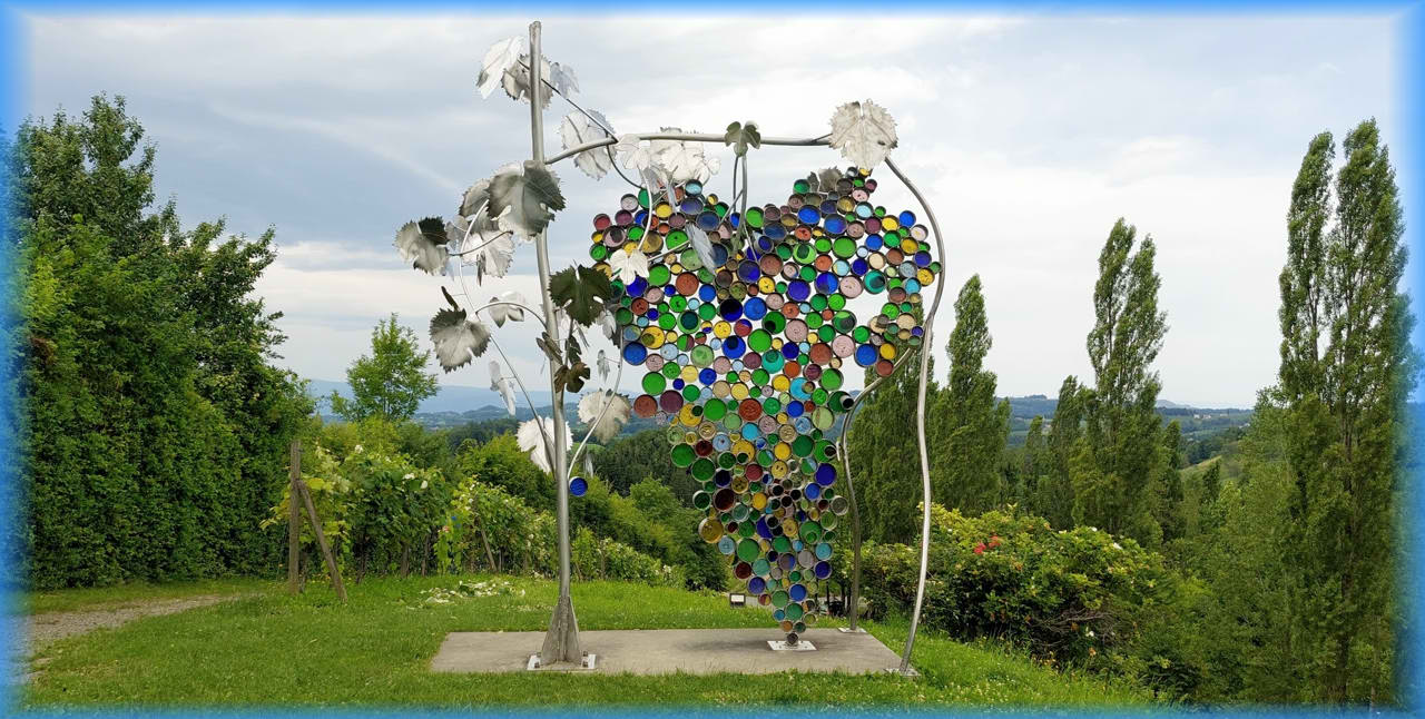 Dieses Kunstwerk, wurde vom Künstler Wilhelm Trojan , aus Edelstahl und farbigem Glas geschaffen. Es hat 365 Glasperlen für die Tage eines Jahres, 52 Teile für die Wochen des Arbeitsjahres der Winzer. Die steile Auffahrt mit E-Bike hinauf zur Weintraube ist schon etwas abenteuerlich. |