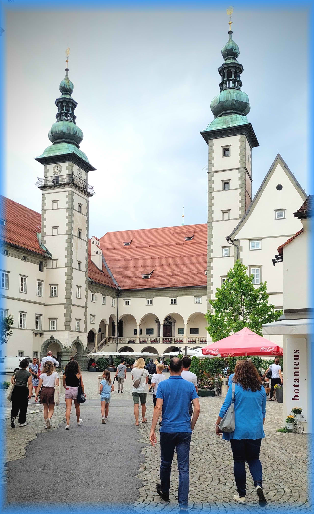 Unser nächster Halt ist die Landeshauptstadt von Kärnten, Klagenfurt am Wörthersee . Wir kommen gegen 11:45 Uhr an und parken günstig gelegen im Parkhaus der City Arkaden am Heuplatz. Das repräsentative Landhaus hat einen Grundriss der hufeisenförmig ist und ein steiles Satteldach es wurde 1574–1590 erbaut. Im Innenhof sind ein zweistöckiger Arkadengang sowie zwei schlanke Zwiebeltürme zu bewundern. |
