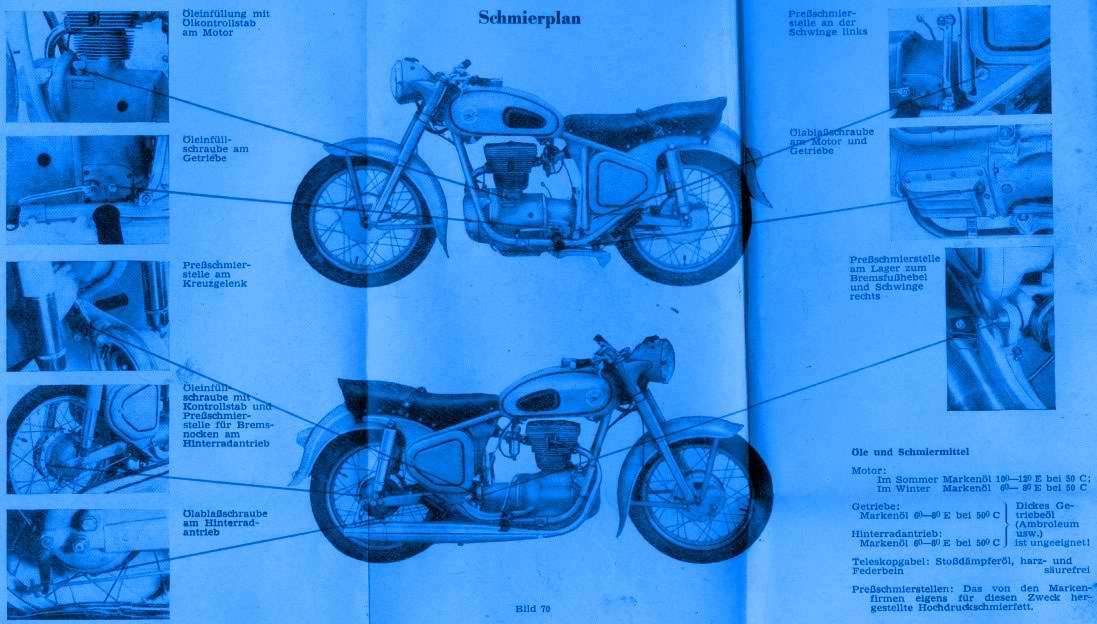 4 Pflegeanweisungen4.1 Allgemeines - Einfahren - Vor der ersten Fahrt beachtennächster Punkt ; IndexDie Betriebs- und Fahrsicherheit des Motorrads hängen unmittelbar von der Wartung und Pflege desselben ab. Dies gilt vor allem während der ersten Zeit der Benutzung, also während der Einfahrzeit. Wir geben deshalb im nachfolgenden Richtlinien für die durchzuführenden Wartungs- und Pflegearbeiten und empfehlen, diese Arbeiten regelmäßig und gewissenhaft zu erledigen. Um dem oftmals noch unerfahrenen Motorradfahrer behilflich zu sein, gibt das Herstellerwerk neben dieser Betriebsanleitung noch ein Kundendienstheft heraus. Nach diesem müssen während der Garantiezeit fünf Durchprüfungen von den Vertragswerkstätten ausgeführt werden, wenn die Garantiegewährung erhalten bleiben soll. Die Garantiegewährung erstreckt sich für die vom Herstellerwerk gefertigten Teile auf sechs Monate nach Erstzulassung, höchstens jedoch bis zu einer Gesamtfahrstrecke von 10000 km. Für die von der IKA hergestellten Teile der elektrischen Anlage gelten die von der IKA herausgegebenen eigenen Garantiebestimmungen. Demzufolge sind Arbeiten an der fahrzeugelektrischen Anlage nur von den IKA-Kundendienstwerkstätten auszuführen. Ein Abdruck der AWO- und der IKA-Garantiebestimmungen sowie der zur Zeit bestehenden AWO- und IKA-Vertragswerkstätten findet sich unter 6. -Ersatzteilbeschaffung und Technischer Dienst -. Zur Erhaltung des guten äußeren Aussehens der Maschine beansprucht dieselbe eine gewisse Pflege, wozu nachstehend einige Hinweise gegeben werden: