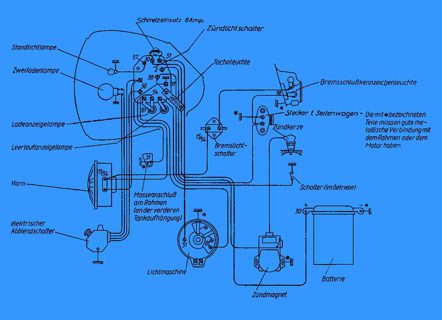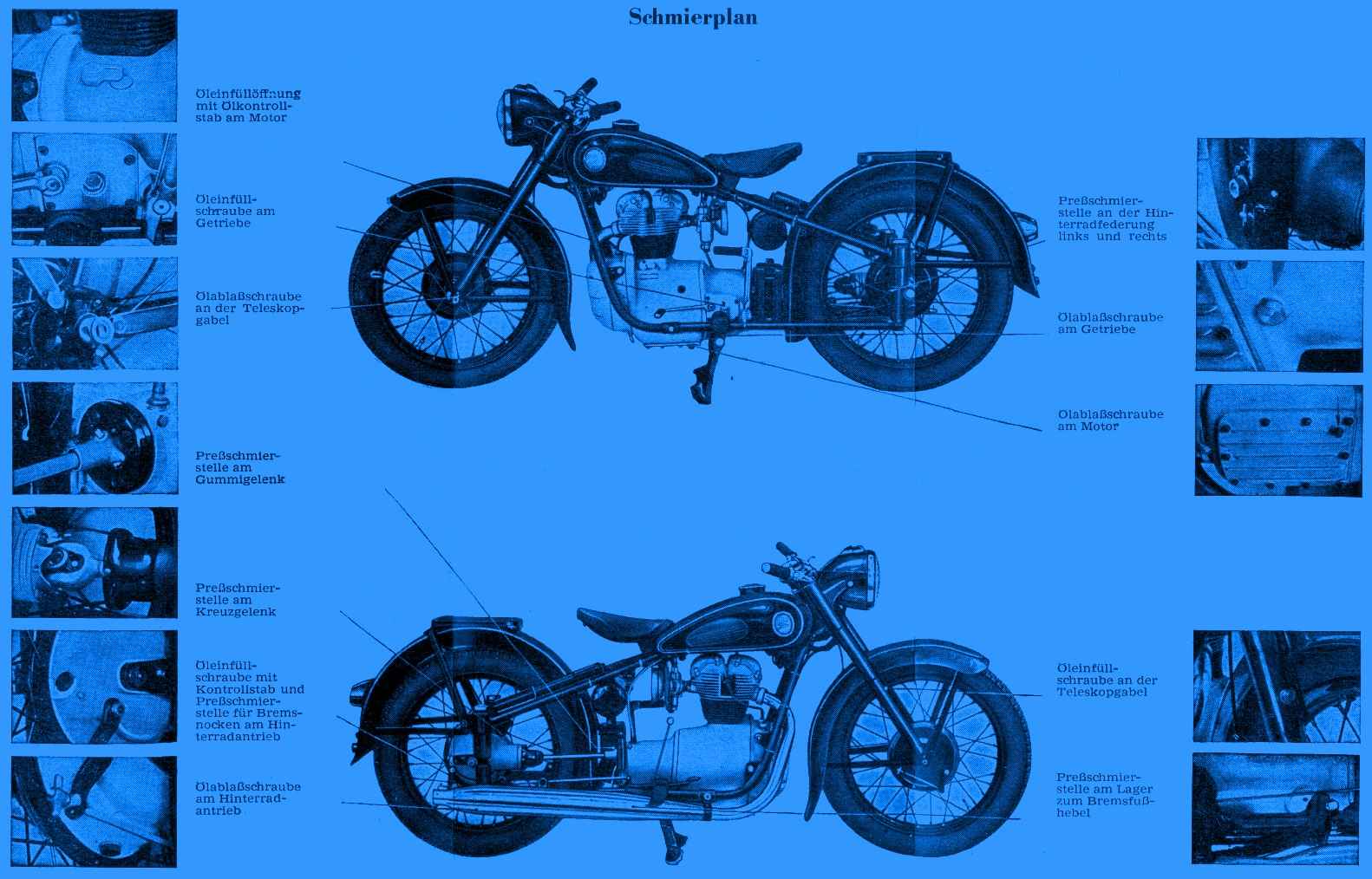 Öle und Schmiermittel Motor: Im Sommer Markenöl 12°...15° E bei 50° C; im Winter Markenöl 8°...10° E bei 50° C. Getriebe: Markenöl 6°...8° E bei 50° C Dickes Getriebeöl (Ambroleum usw.) ist ungeeignet! Hinterradantrieb: Motorenöl 6°...8°E bei 50° C Dickes Getriebeöl (Ambroleum usw.) ist ungeeignet! Teleskopgabel: Stoßdämpferöl, harz- und säurefrei Preßschmierstellen: Das von den Markenfirmen eigens für diesen Zweck hergestellte Hochdruckschmierfett.